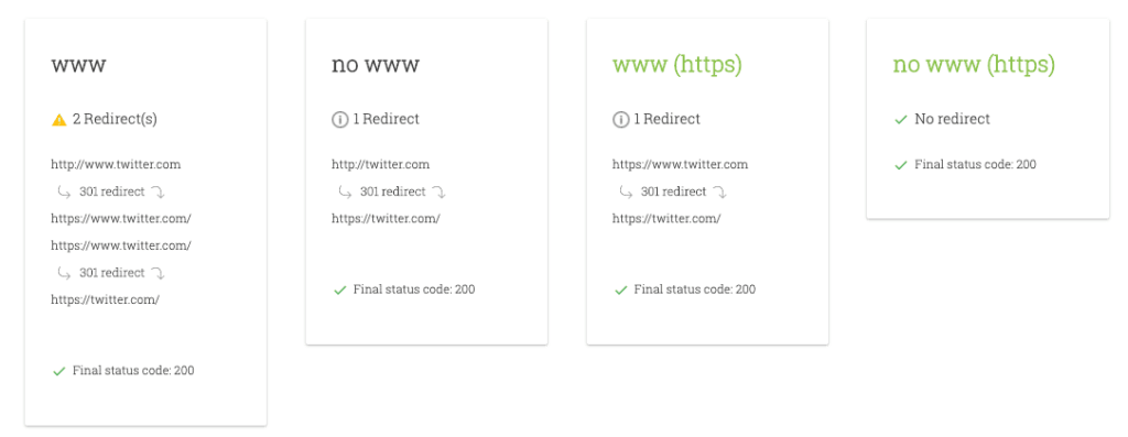 如果您不确定使用协议前缀和子域的不同组合来解析站点URL需要多少次重定向,您可以使用Patrick Sexton的重定向映射器进行检查: