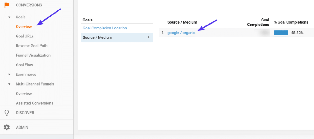 您如何确定当前的内容营销投资回报率?一种简单的方法是检查Google Analytics(假设您已设置目标)。单击转换→目标→概述。查看Source/Medium并查看“google /organic”当前的排名,然后做出明智的决定。在下面的示例中,您可以看到超过48%!
