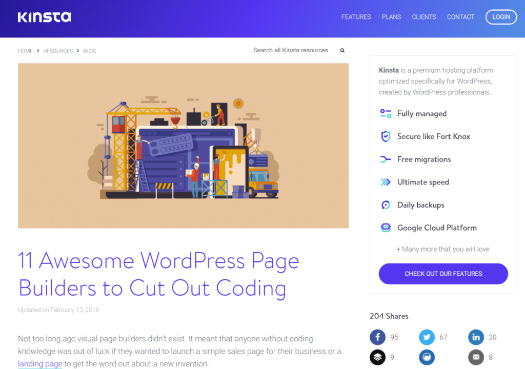 一个很好的例子可以在Kinsta博客上看到他们在WordPress页面构建器上的文章。虽然这段内容与Kinsta的托管服务没有直接关系,但它旨在帮助吸引WordPress用户(社交和评论),以间接方式吸引新客户,当然,搜索引擎流量也不会受到伤害。