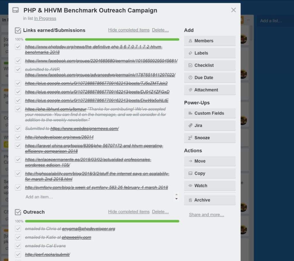 我们最近发布了一篇非常大的PHP基准测试文章,并设置了一个完整的Trello卡,只是为了进行外展(在文章发布之后)。推广您的内容可能与创建内容一样重要,甚至更重要。如果没有人看到它对你没有帮助!