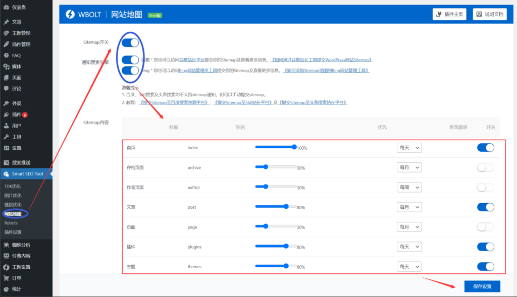 接下来,根据自己的需要,对Sitemap内容进行配置,个人建议,首页、分类页、文章页这三个是必须开启的,其他内容可以根据自身情况来决定;