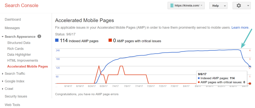 您可以在Google Search Console中的“Search Appearance > Accelerated Mobile Pages”下监控删除Google AMP的进度。正如您在下面看到的,在我们实施上述策略的那一刻,我们的AMP URL开始去索引。您还可以尝试重新提交站点地图文件以加快流程。根据您编入索引的AMP页面数量,此过程可能需要几天到几周的时间。