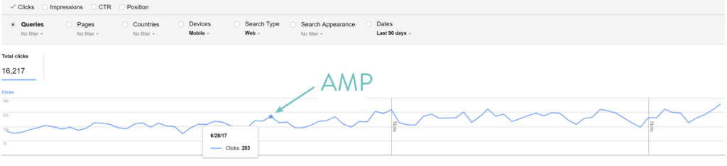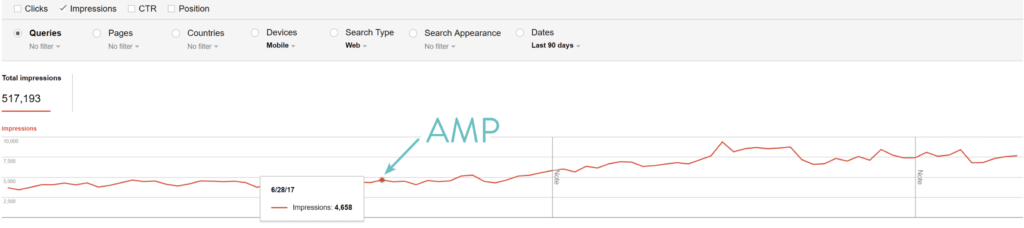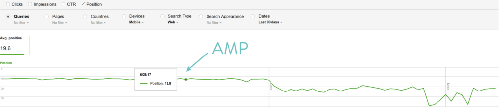 如您所见,在启用Google AMP并允许他们有时间进行索引后,我们肯定看到移动设备上SERP的平均排名有所下降。