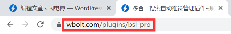 该字段显示此页面的URL:https://www.wbolt.com/plugins/bsl-pro。(您的浏览器可能会隐藏HTTPS,直到您双击该字段。)