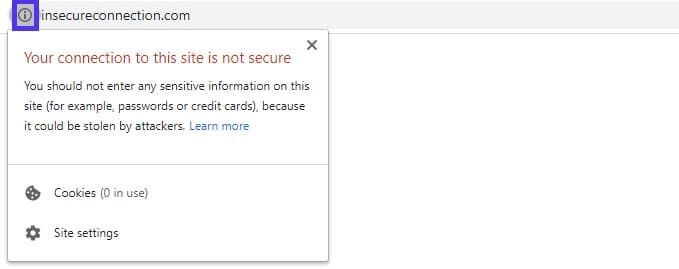 如果站点使用HTTP,它会显示一个可以展开的注意标记,警告您不要向站点提交任何敏感信息。