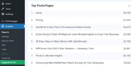 在WordPress中设置Google Analytics后,您现在可以通过从WordPress管理面板转到Insights » Reports来查看您网站上最重要的页面。