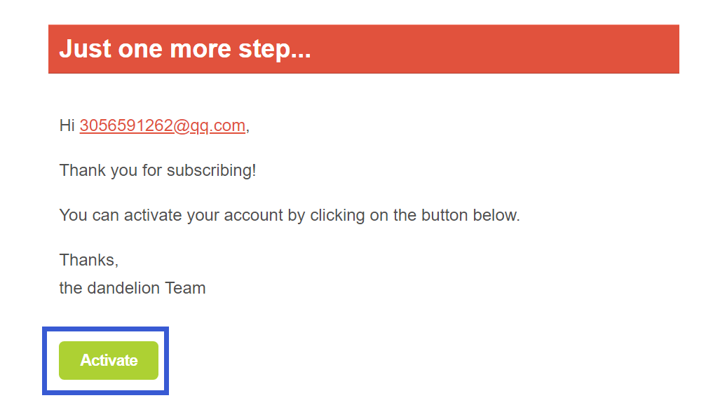 步骤 3:提交创建账号申请后,您将会收到一封邮箱地址验证邮件。打开邮件,点击“Activate”按钮。