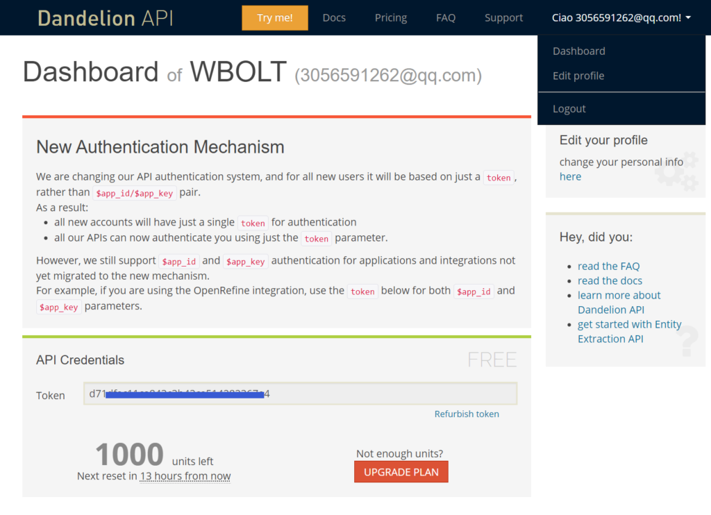 步骤 4:在登入Dandelion网站的状态下,点击右上角的账号信息下拉菜单“Dashboard”进入账号控制面板,您将会看到Dandelion API Token,复制该token;