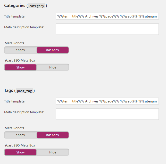 Yoast SEO将使用类别和标签页面上的标题模板和元描述模板。建议将分类和标签元描述模板留空,因为即使允许搜索引擎索引这两类页面,搜索引擎也会单独爬取内容作为搜索引擎搜索结果的描述文字。