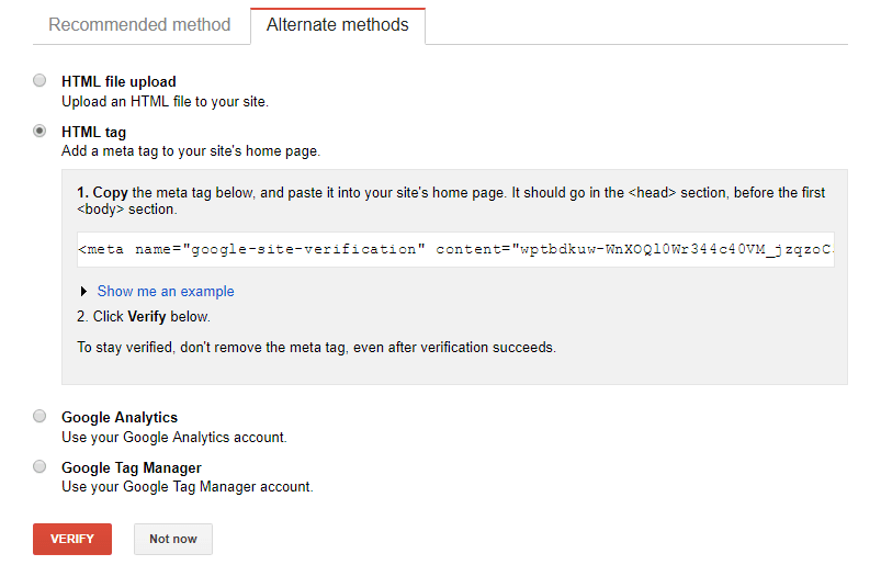 我将在后面的部分中介绍如何使用此选项卡验证您的网站。如果您其他方式完成网站站长工具域名所有权验证,则可以将这些字段留空。因为站长工具的域名所有权验证只是一次性过程。