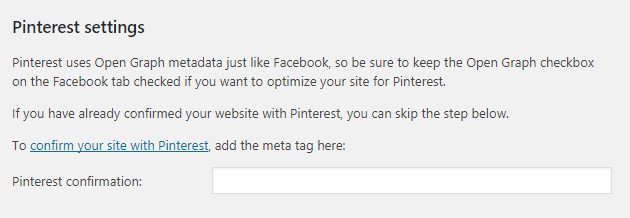 要使用Pinterest确认您的网站,请按照本教程在Pinterest上,然后在此选项卡的字段中输入确认代码。