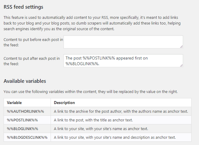 RSS选项卡下的选项允许您在Feed中的每个文章之前和之后放置内容。这是相当技术性的,我不建议您更改这些设置,除非您真的知道自己在做什么。