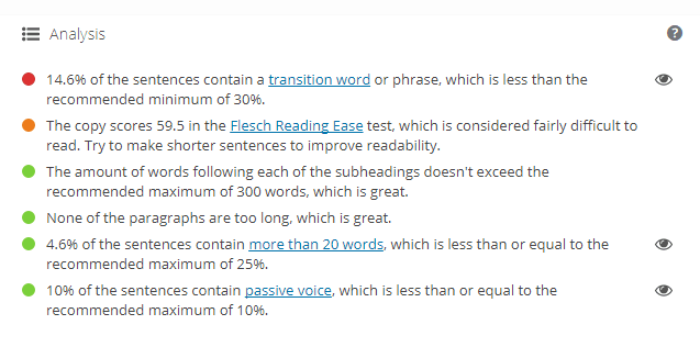 - Readability analysis-可读性分析:可读性分析提供了改善内容结构和样式的建议。在尝试提高内容质量时,该功能会有很大帮助。