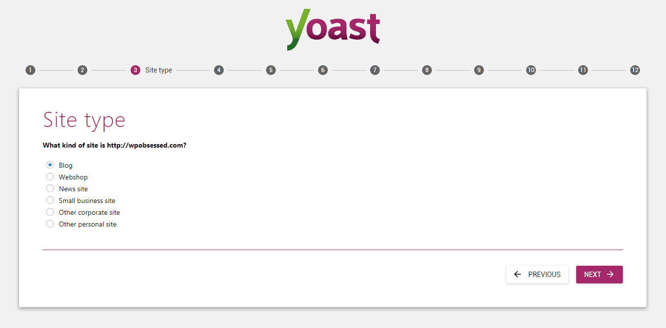 选择最适合您网站的网站类型。这将有助于Yoast SEO更好地配置您的网站类型的设置: