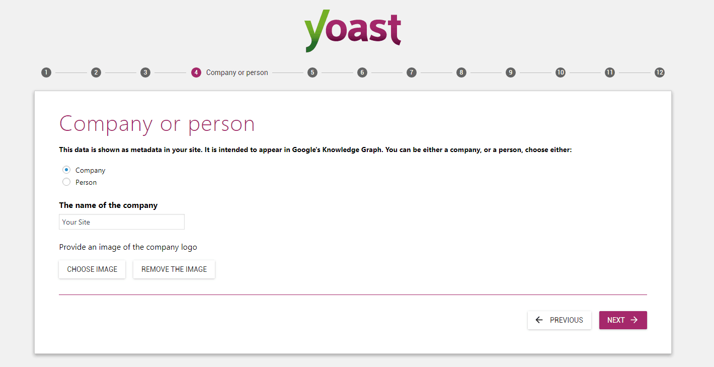 如果您运行个人网站,请选择“个人(Person)”,企业则选择“Company”。之后,输入您或您公司的名称,然后单击下一步按钮: