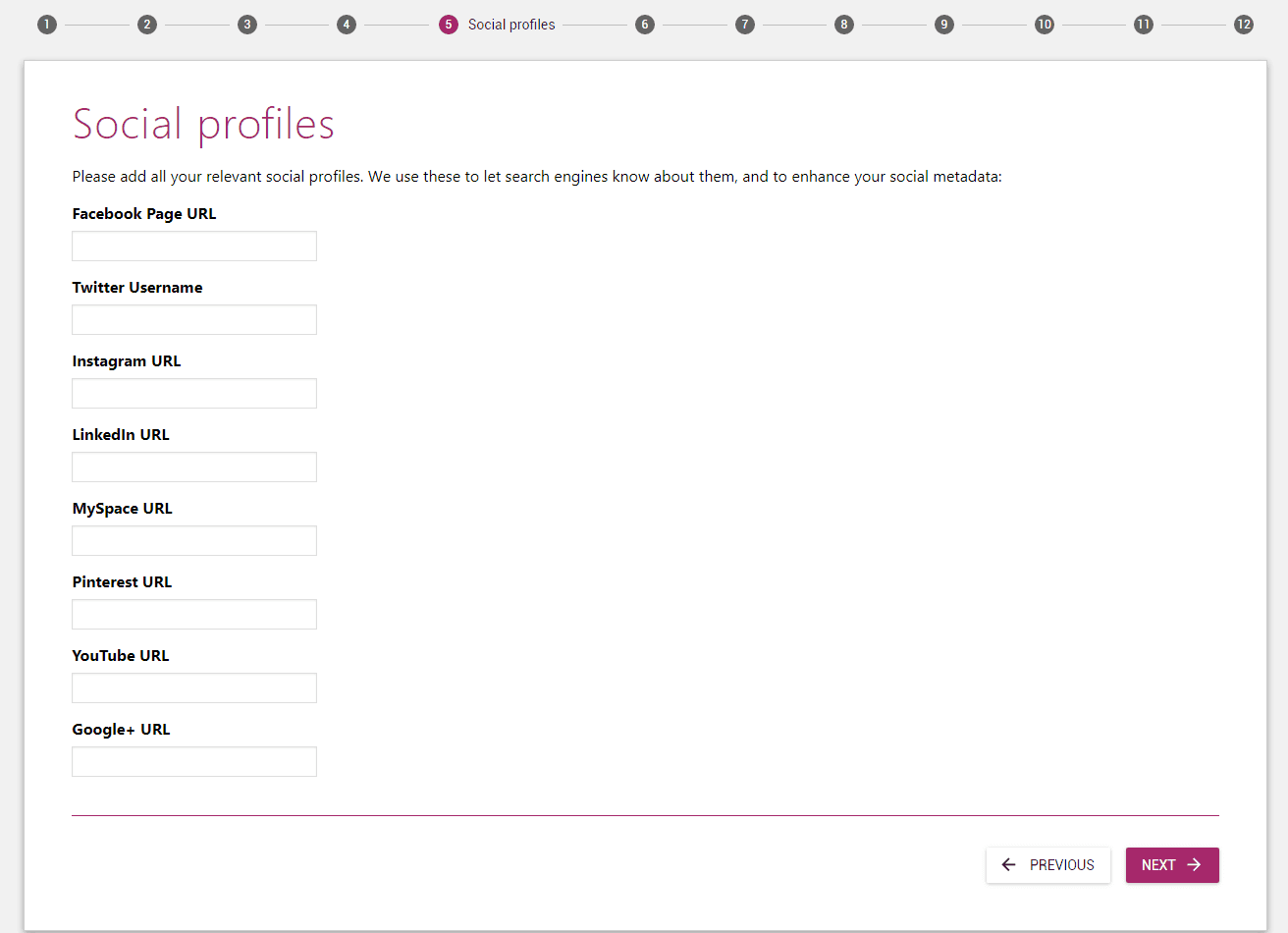 第5步中的社交个人资料是可选的,如果您不想链接社交网站个人资料到您的博客,留空即可:
