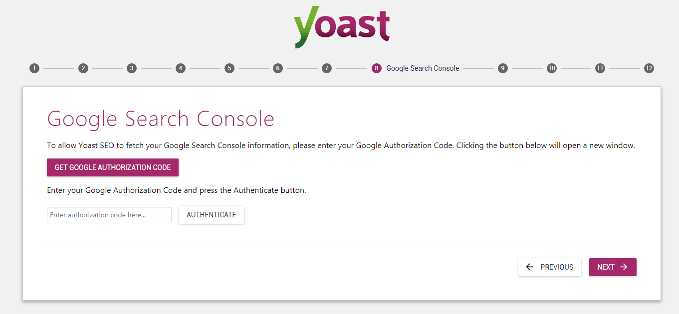 如果您有兴趣将Yoast SEO连接到谷歌站长工具Google Search Console,请点击Get Google Authorization Code按钮: