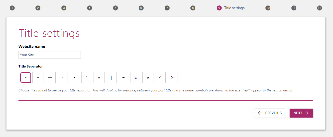 该步骤允许您设置网站名称,选择标题分隔符(分隔符建议使用默认的“-”即可)。