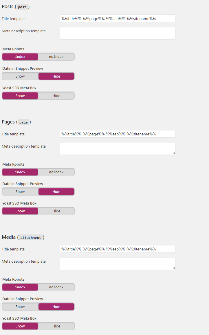 - 元爬虫:这是一个重要的选择。您可以选择索引或noindex作为设置。当您将其设置为noindex时,搜索引擎将不会为该页面建立索引,也不会在搜索结果中显示该页面。建议您将文章和页面设置为索引,并将媒体设置为noindex。WordPress,默认情况下,会为您上传到网站的所有媒体(图像,视频等)创建一个单独的页面。如果您将媒体设置为索引,则Google会为您的所有媒体页面建立索引。因此,除非您知道自己在做什么,否则将媒体设置为noindex。注:最新版本已经取消了这个参数的设置。