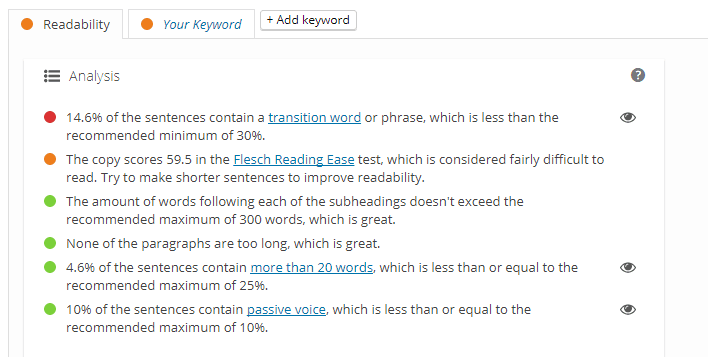 Yoast SEO Meta Box的可读性分析选项卡将帮助您提高内容的可读性。