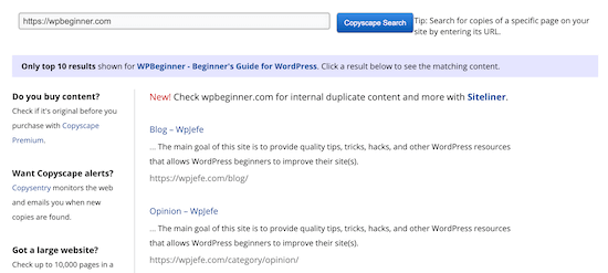 所有您需要做的就是导航到Copyscape并输入您的网站URL。您还可以输入页面或文章URL,以查看博客文章或网站页面是否已被复制和被抄袭。