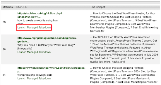 一旦发现某个网站抄袭或窃取了您的内容,您可以点击“Launch Managed Takedown”以开始下架过程。