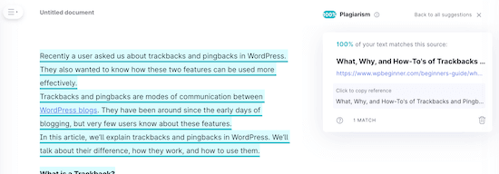 高级版Grammarly内置了剽窃检查功能。您可以将内容复制并粘贴到该工具中,然后它将进行扫描以查看网上是否有任何匹配项。