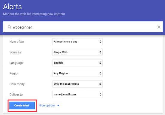 只需导航至Google Alerts。接下来,输入您的网站名称,URL或使用文章的一部分。
