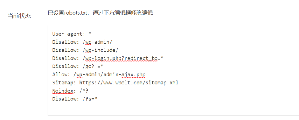 插件将会下面显示默认的robots.txt文件,此版本为插件预设的默认规则(当前插件版本不支持删除默认规则,只允许添加新规则)