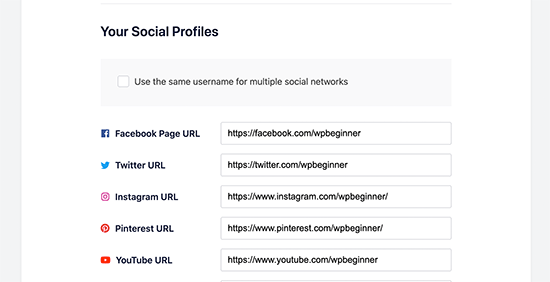 如果向下滚动一点,您将看到“social profile(社交资料)”部分。在这里,需添加与网站关联的社交资料URL。