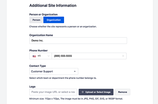 接下来,将安装向导将询问将网站其设置为个人或组织。例如,如果经营的是个人博客,则可能要选择Person。