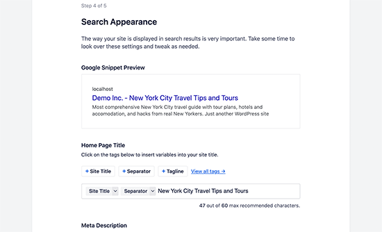 接下来,您将看到“搜索外观”界面。该插件将向您展示网站在搜索结果中的外观的摘要预览,您可以单击来更改首页标题和元描述。