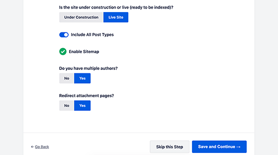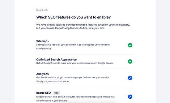 接下来,将要求您启用SEO功能。XML网站地图和搜索优化外观等基本SEO功能已经启用。您也可以选择要启用的其他功能。