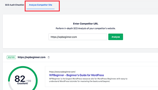 转到“All in One SEO»SEO Analysis”页面,然后切换到“Analyze Competitor Site”标签。输入竞争对手网站的URL,以生成分析报告。