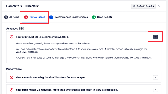 如果有任何关键问题,只需单击“Critical Issues”选项卡,即可看到需要修复的问题列表。您可以单击每个项目旁边的箭头展开查看如何修复的建议。