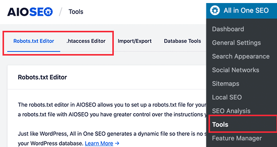 有时,在遵循WordPress教程或指南时,您可能需要编辑robots.txt或.htaccess文件。你可以使用All in One SEO编辑这两个文件。