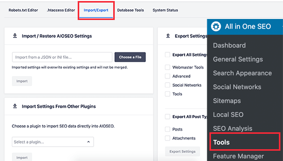 All in One SEO支持从第三方插件导入SEO数据。转到“All in One SEO » Tools”页面,然后切换到“Import / Export”标签。