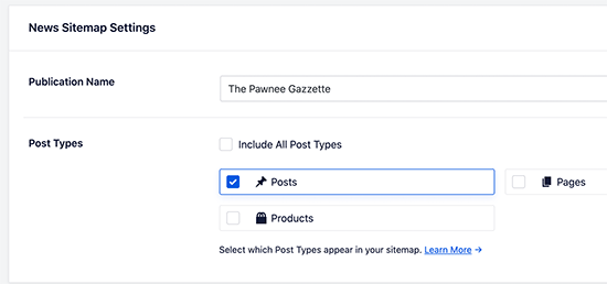 然后设置出版商名称并选择要用于新闻站点地图的文章类型。