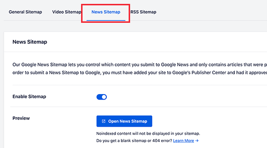 All in One SEO可以为您的网站生成新闻站点地图。只需切换到“News Sitemap”标签,然后打开“Enable Sitemap”开关即可。