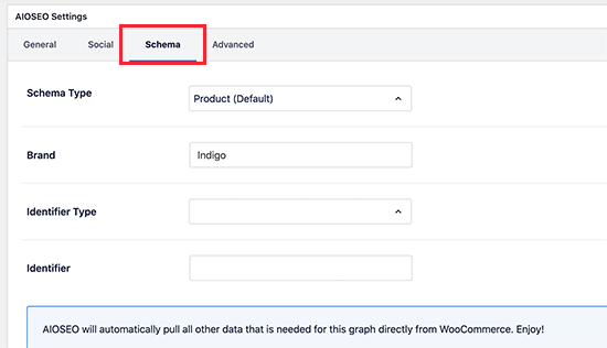 AIOSEO将自动选择正确的Schema类型,并使用诸如产品价格,库存可用性等数据。您可以根据需要填写品牌,标识符类型和标识符字段。