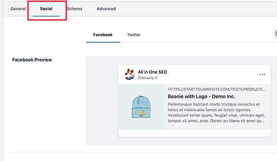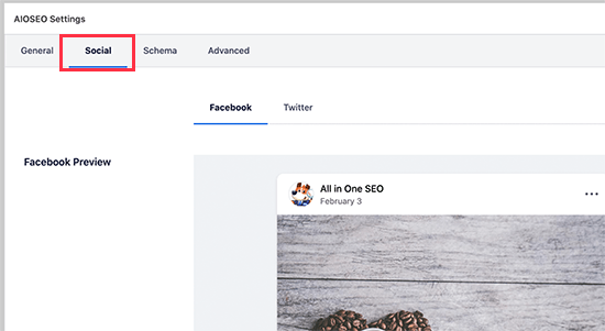 接下来,您需要在AIOSEO设置下切换到“Social(社交)”标签。在这里,您可以使用Facebook和Twitter的预览来控制此文章/页面在社交媒体平台上的显示方式。