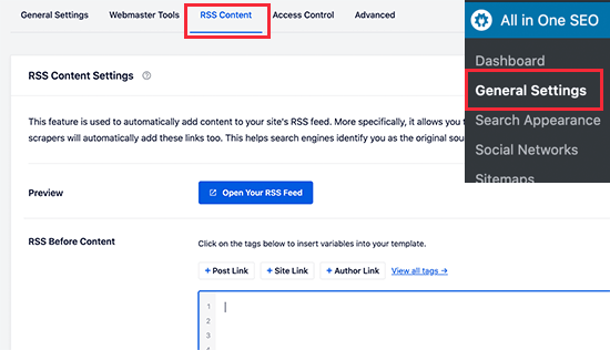 访问“All in One SEO » General Settings”页,然后切换到RSS content标签。