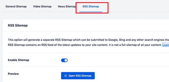 All in One SEO可将RSS网站地图添加到您的网站。只需切换到RSS Sitemap标签,然后启用“ Enable Sitemap”开关。