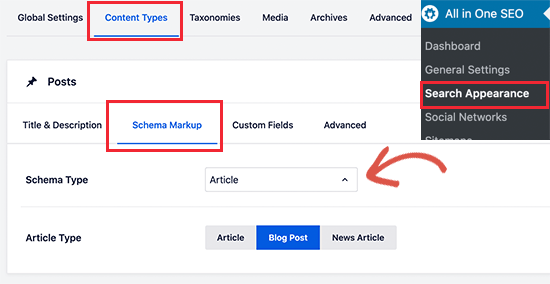 首先,访问“All in One SEO»Search Appearance”页面,然后切换到“Content Types”标签。切换到“Schema Markup”选项卡。