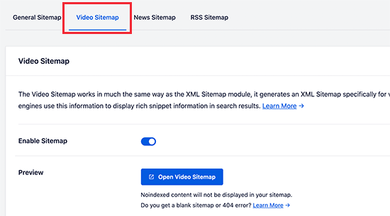 通过切换到“Video Sitemap ”标签,启用“Enable Sitemap”开关来启用视频XML站点地图。
