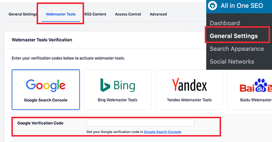 转到All in One SEO»General Settings页面,然后切换到Webmaster Tools标签。单击Google Search Console,然后贴入复制的验证码。