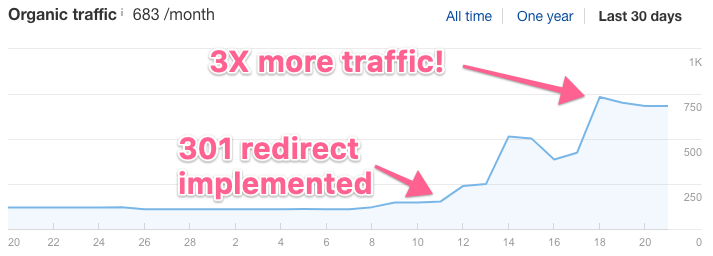 这项改动的意义重大,这也是为什么301重定向对于促进自然搜索流量如此重要的部分原因。(后面我们深入讨论!)