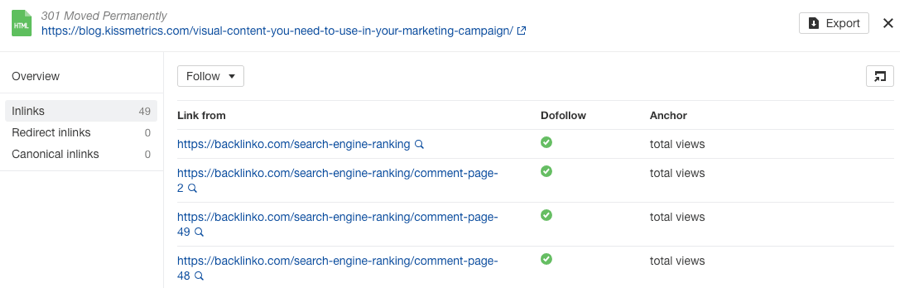 但是这么做有一个注意点,你不应为带有低质量外链的页面做重定向。这样做会害多利少,因此在进行重定向操作前,你应该为每个页面查看网站分析板块中的外链报告。