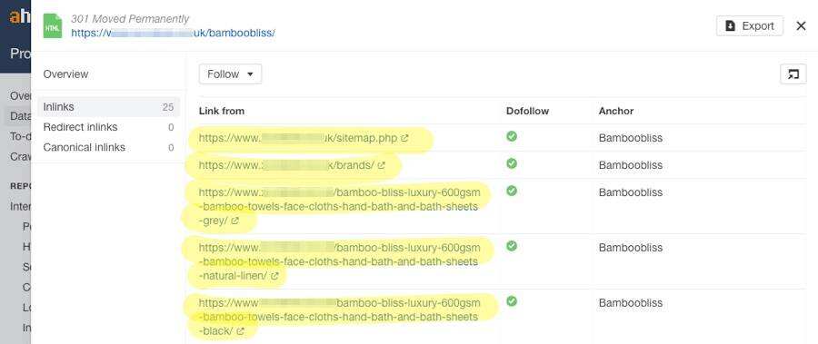 为了尽可能保证新页面的相关度,同时中合 Google 将301重定向视作404的风险,我们还可以在网站分析板块的锚文本报告中检查每个页面的情况: