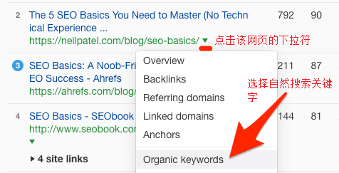 点击排名高于你的页面的下拉符号,然后选择“自然搜索关键词”